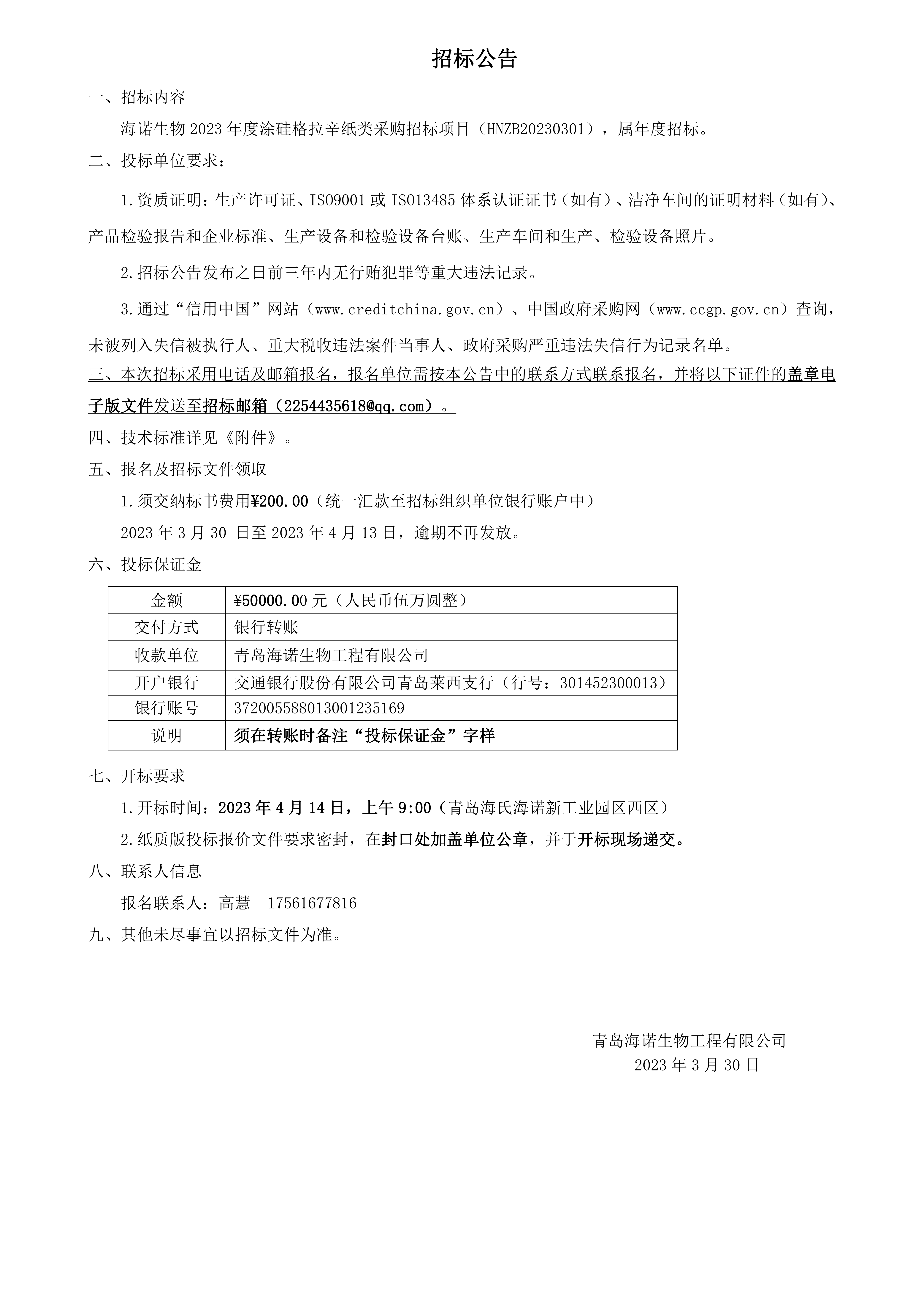 海诺生物 2023 年度涂硅格拉辛纸类采购招标项目正式开启